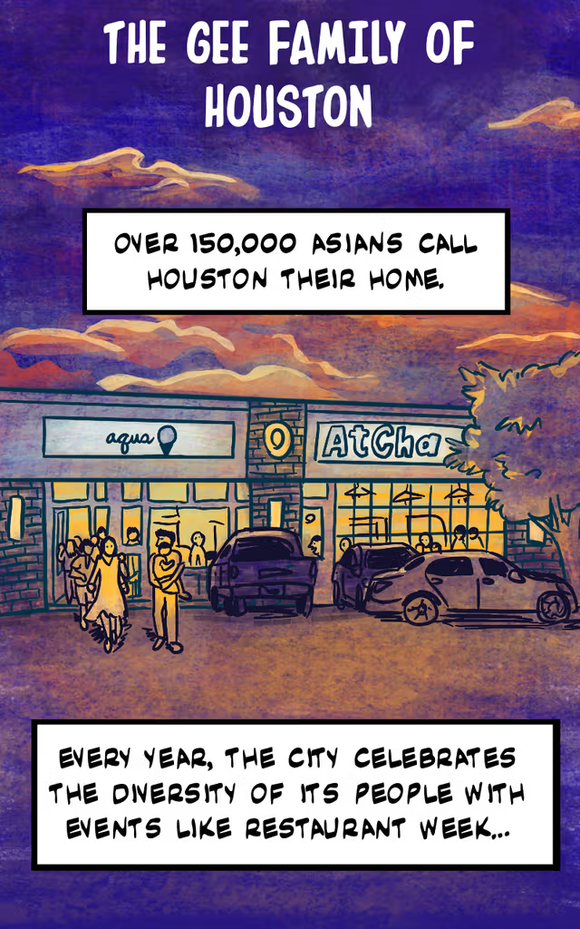“The Gee Family of Houston” is a nonfiction work by Laura Gao. This web comic covers the impact and continued influence of the Gee family in Houston. Readers will see how they laid the groundwork to fight against racial discrimination and segregation into what Houstonians know today as Asiatown. Laura Gao’s expressive artwork woven into their storytelling allows readers to walk through the lives of Houston’s earliest Asian American immigrants, and witness their efforts to improve the lives of their respective communities.